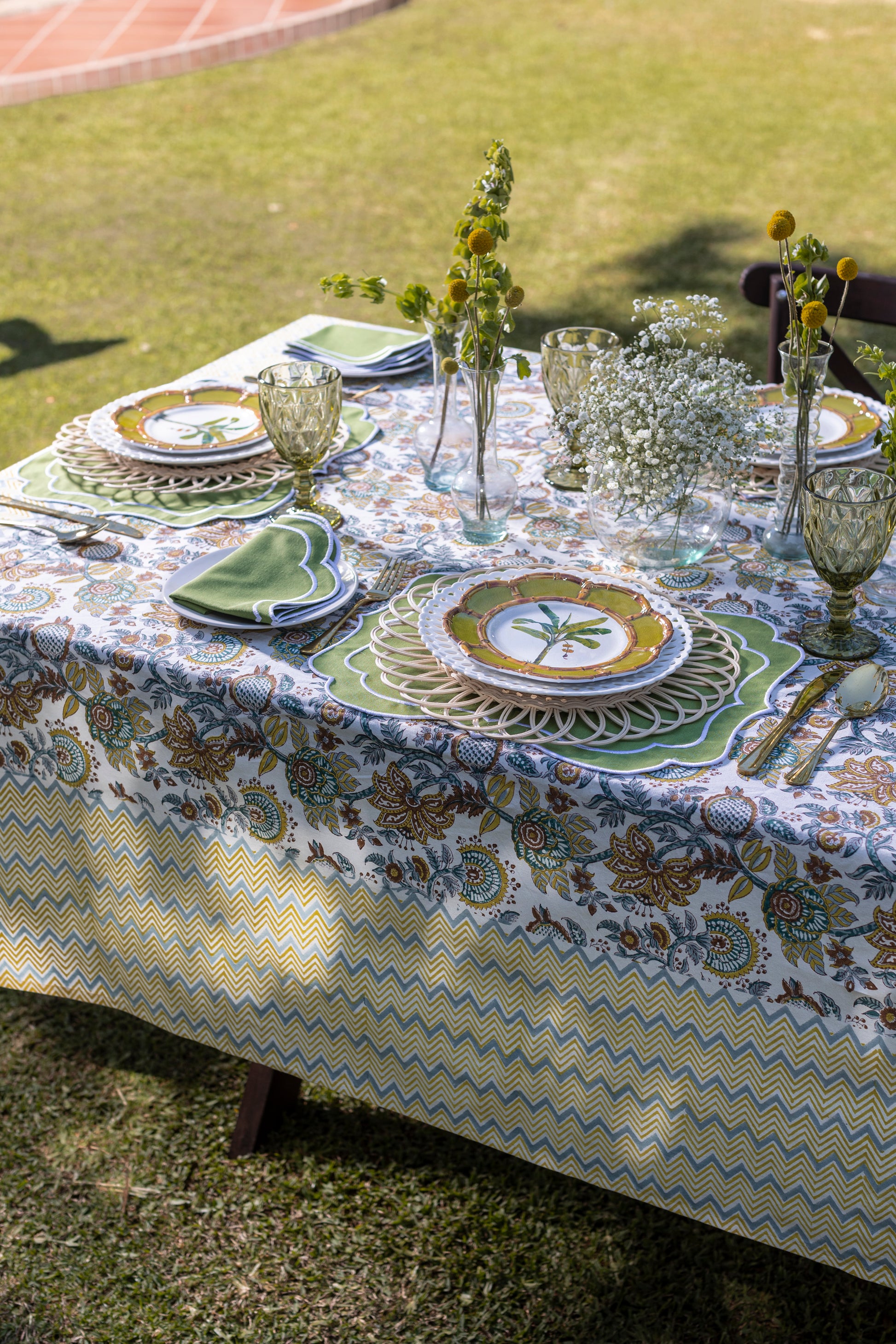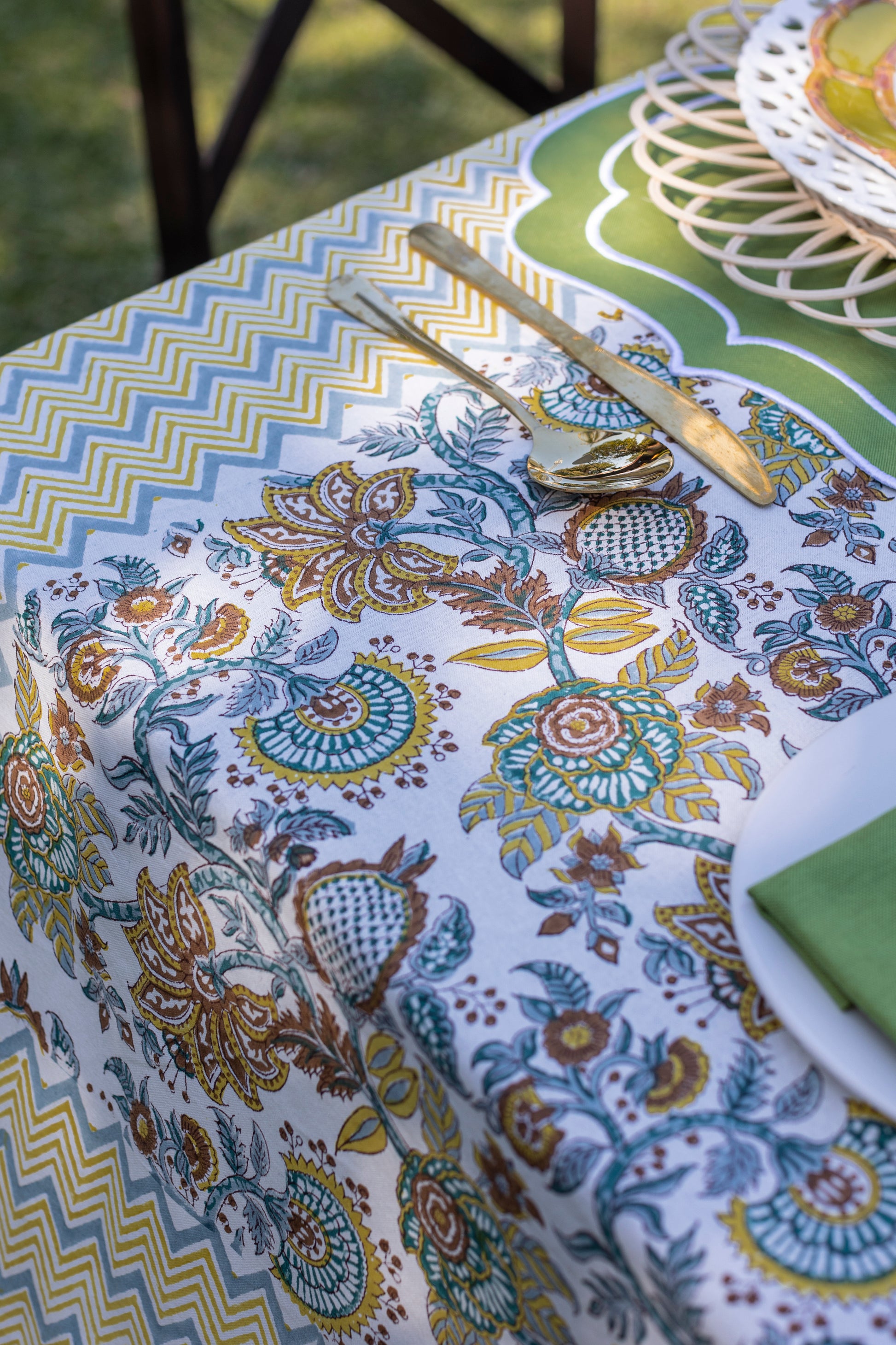 El diseño tropical de "Coconut" es hermoso pero su calidad de construcción es igualmente impresionante. Cada mantel está hecho a mano por artesanos Hindúes en la Ciudad Rosa (Jaipur) utilizando técnicas tradicionales de estampado, lo que significa que cada mantel es único debido a las variaciones en el textil. Además, el material de algodón puro es duradero y fácil de limpiar, lo que lo convierte en una elección práctica para cualquier hogar.