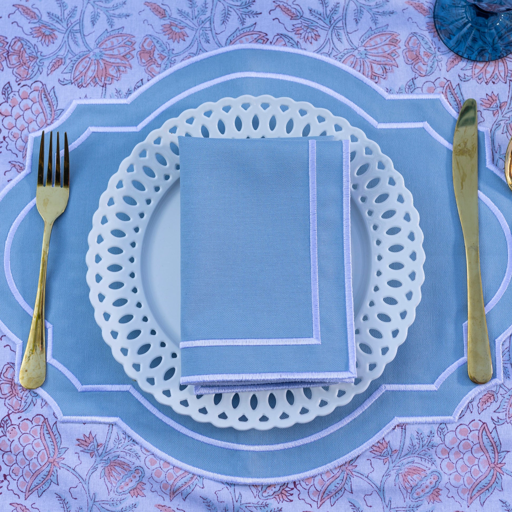 Nuestro set de servilletas y manteles individuales "Mulberry" está diseñado en un tono baby-blue con un sutil bordado en blanco para que tu mesa se vea siempre elegante.